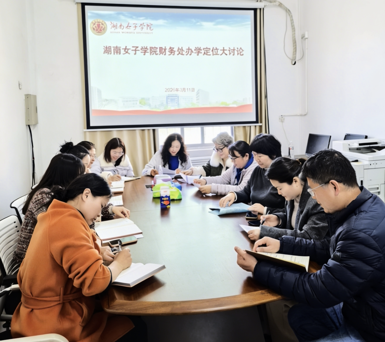 本网讯(财务处 谭美)为深入贯彻落实学校办学定位大讨论工作部署,锚定学校高质量发展目标,3 月 11 日下午,财务处在办公楼 208 会议室召开办学定位大讨论专题研讨会。会议由财务处负责人欧珺主持,财务处全体工作人员参会。